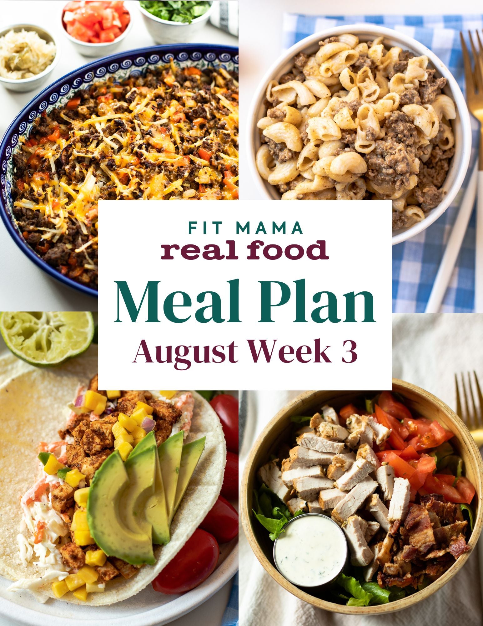 Grab the August Week 3 Meal Plan! Included are 4 dinners that are all healthy, balanced, and kid-friendly recipes that will offer variety and color all throughout the week. The recipes focus on whole foods and leave out overly processed ingredients.